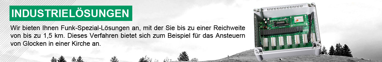 Wir bieten Ihnen Funk-Spezial-Lösungen an, mit der Sie bis zu einer Reichweite von bis zu 1,5 km. Dieses Verfahren bietet sich zum Beispiel für das Ansteuern von Glocken in einer Kirche an. Oder zum Auslösen eines Alarmsignals auf einem großen Gebiet. Diesem Funk ist kaum eine Grenze gesetzt.