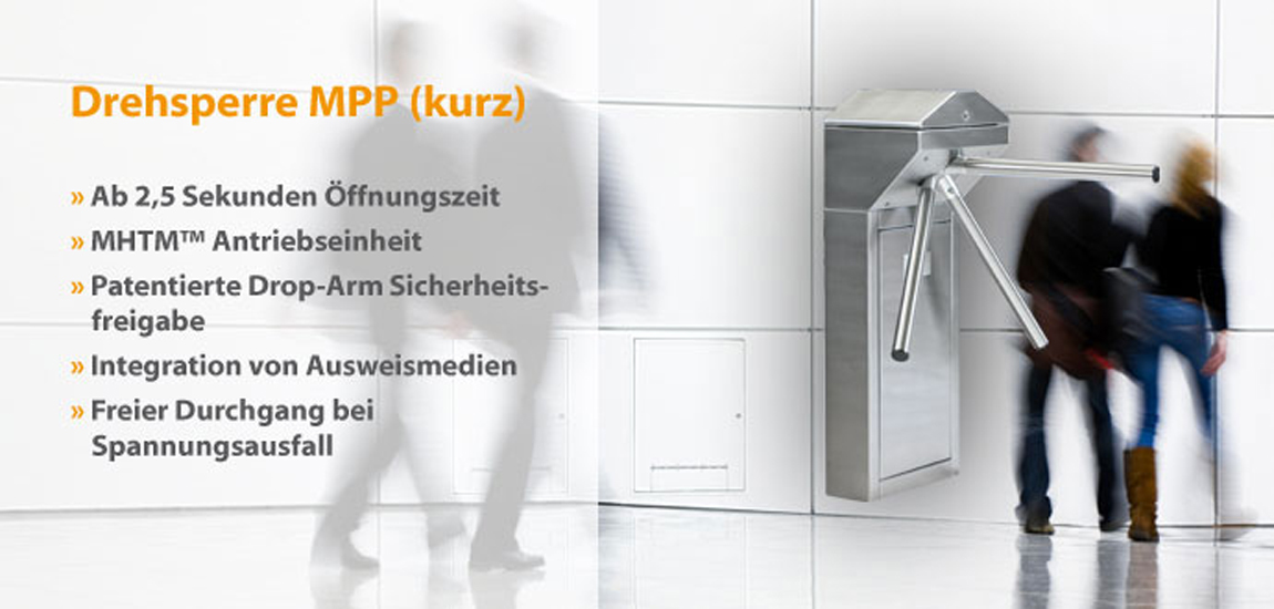 Die Drehsperre MPP ist in zwei Gehäusevarianten mit den Schutzklassen IP32 und IP44 verfügbar. Beide Varianten sind durch ein optionales Aufbaugehäuse problemlos durch Kontrollsysteme wie Kartenleser, Fingerabdruck-Scanner, etc. erweiterbar. Als Sperrelement dienen drei Sperrarme, welche den Durchgang in beide Richtungen ermöglichen.