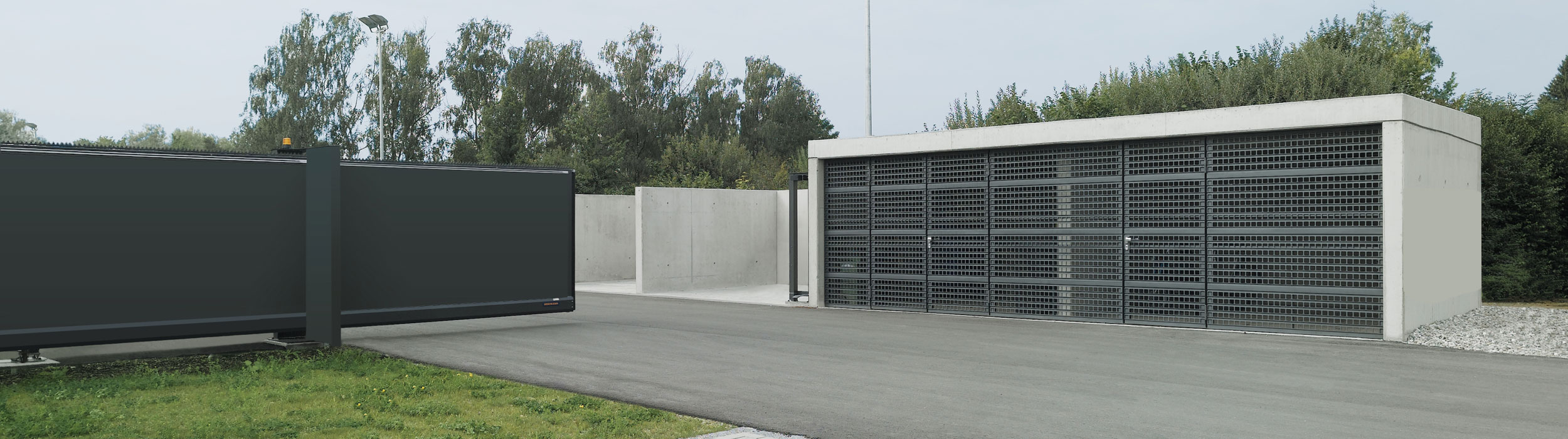 Die ideale Sicherung breiter Durchfahrten Hofschiebetore aus stabilen Stahlprofilen werden als komplettes Element mit einer Offnungsbreite bis 16 m geliefert. So kann bei gegenlaufigen Anlagen eine Breite von 32 m erreicht werden. Die Konstruktion ist freitragend. Die Vorteile: Nur geringe Fundamentarbeiten, keine Führungsschienen-Montage, keine Störungen des Torlaufs bei Eis, Schnee oder grober Verschmutzung.